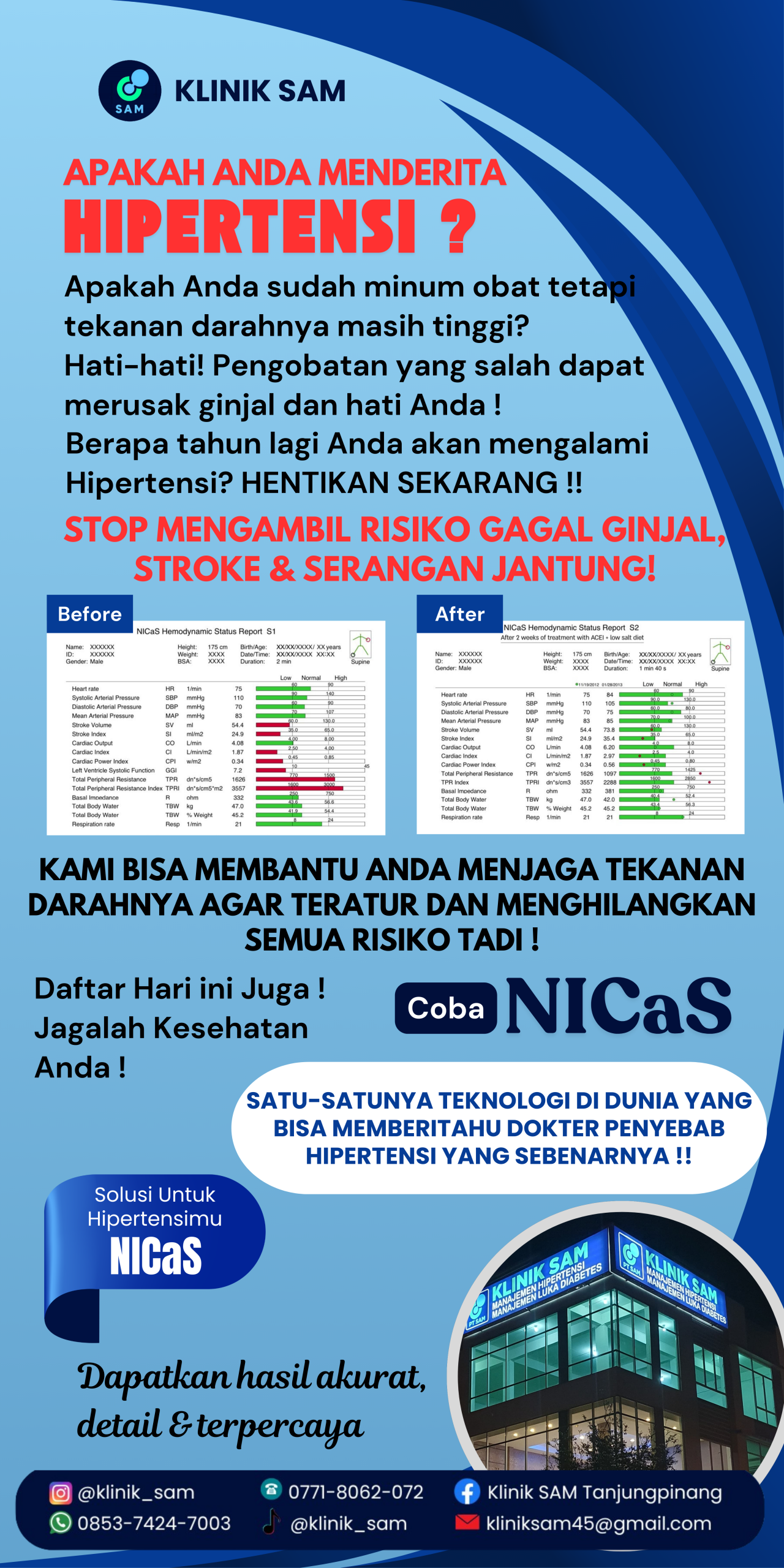 NICaS adalah teknologi kedokteran terbaru yang memungkinkan dokter untuk membantu memantau kesehatan jantung. Merupakan skrining awal bagi para pasien hipertensi. Alat ini mudah digunakan karena tidak membutuhkan tindakan invasif dan biaya lebih terjangkau. NICaS dapat memberikan penilaian akurat terhadap sistem kardiovaskular (curah jantung, beban jantung, dan volume cairan Anda).